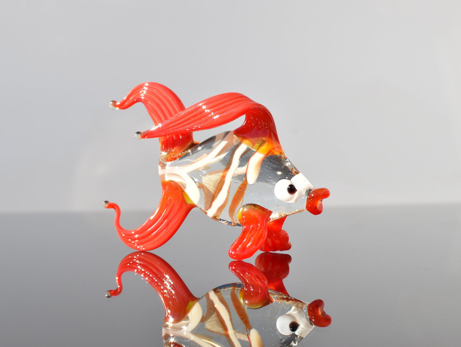 Cute Glass red-clear colorful goldfish. Detailed figurine with a lot of character and personality. Excellent addition to your collection.