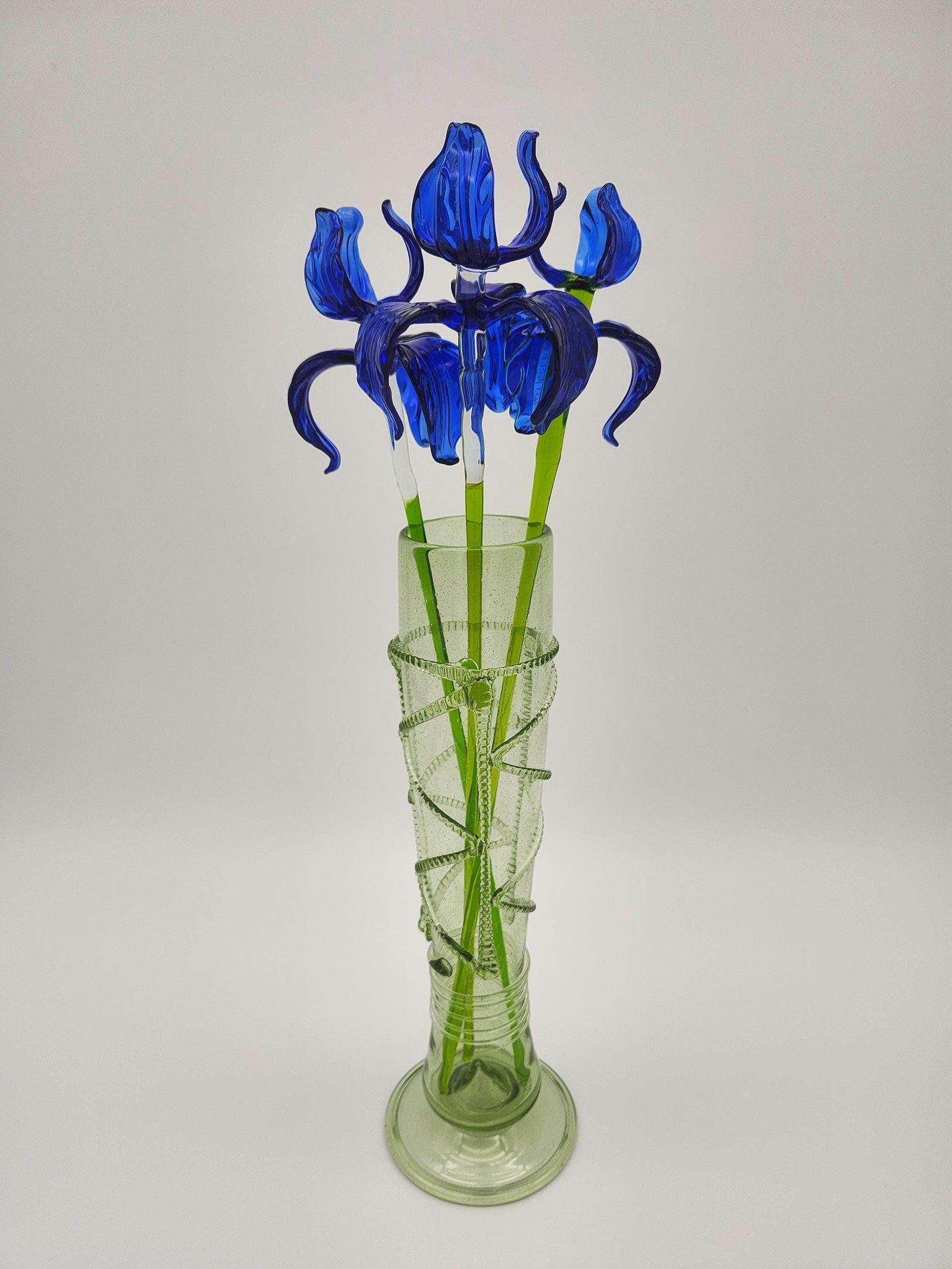 Handblown Blue Glass Iris Bouquet in Emerald Green Spiral Vase
