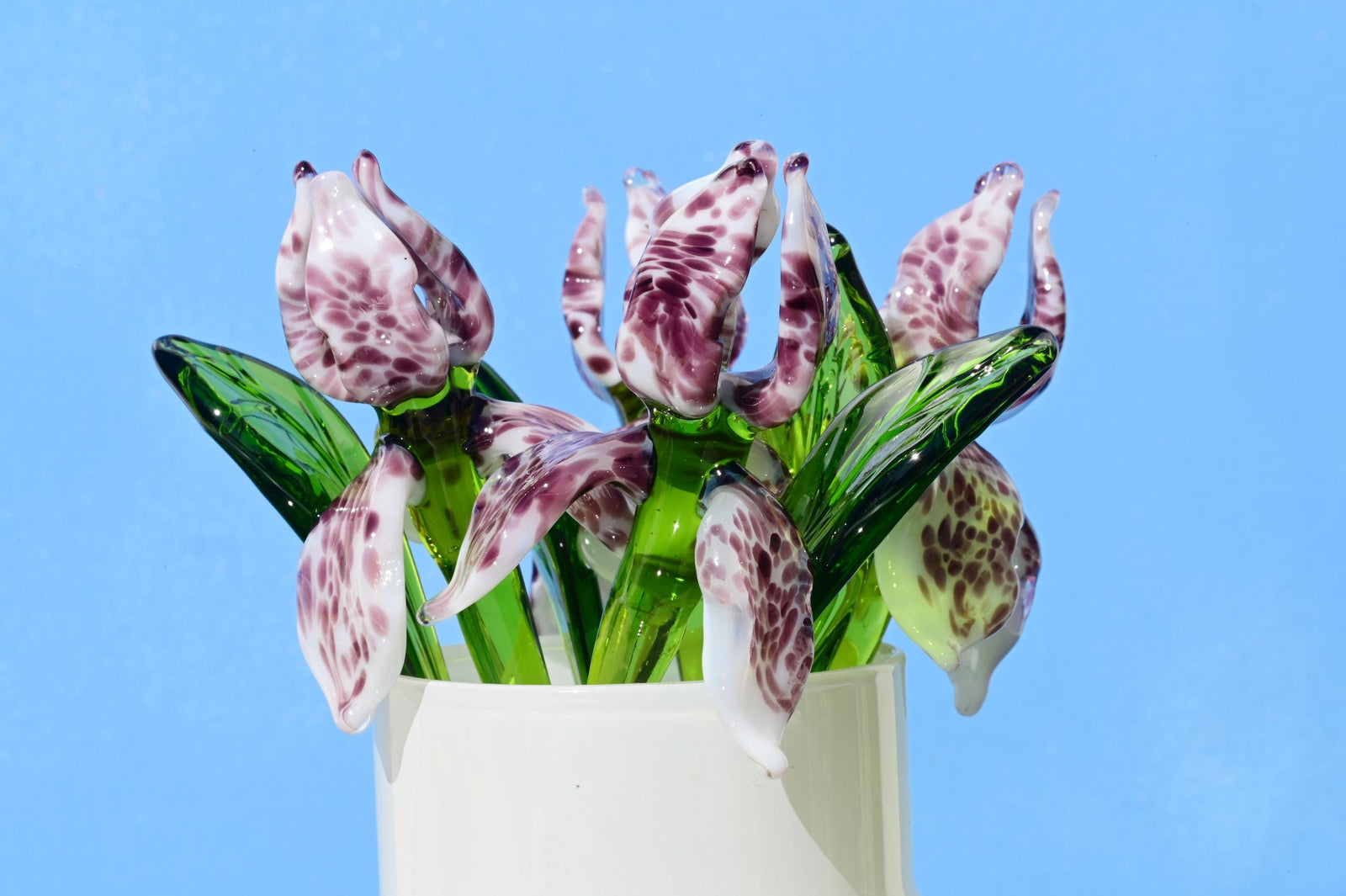 Handmade Leopard Glass Iris Flower, Purple Spotted Sculpture, 8 Inch